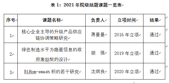 截至2021年11月3日,我院共有3项课题申请结题,21项课题申请延期。根据《关于公布2016年度院级课题立项的通知》(上财浙院教字〔2017〕1号)、《关于公布2019年度院级课题立项的通知》(上财浙院教字〔2019〕70号)、《关于公布2020年度院级课题立项的通知》(上财浙院教字〔2020〕57号)有关规定,我院对申请结题和延期结题的课题材料进行详细审阅后,经过专家评审,其中3项课题符合结题要求,同意结题。现将结果予以公布(见表1)。希望各系(部)、部门要进一步加强对各类课题的管理与指导,希望未达到结题要求以及提出延期的课题组按照有关规定和课题研究计划认真开展研究工作。