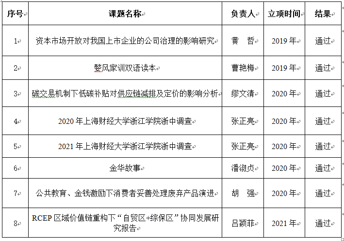 截至2022年11月20日,我院共有8项课题申请结题,19项课题申请延期,7项课题申请撤销。根据《上海财经大学浙江学院发展基金使用办法》、《上海财经大学浙江学院发展基金使用补充管理条例》有关规定,我院对申请结题和延期结题的课题材料进行详细审阅后,经过专家评审,其中8项课题符合结题要求,同意结题。现将结果予以公布(见表1)。希望各系(部)、部门要进一步加强对各类课题的管理与指导,认真开展研究工作。