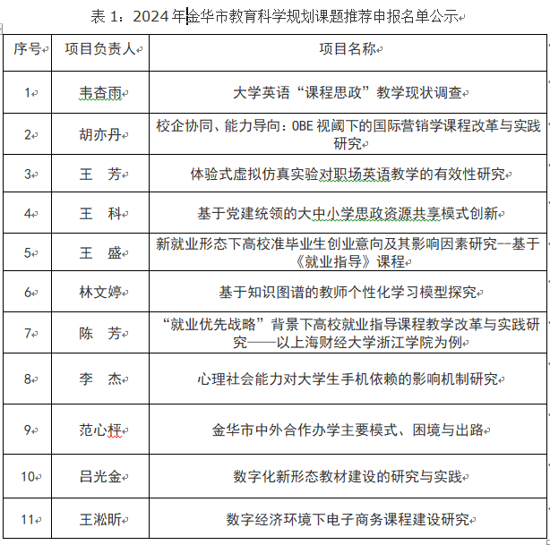 根据《关于开展2024年度金华市教育科学规划研究课题申报工作的通知》(金市教规〔2023〕8号)文件新要求,今年我院金华市教育科学规划课题共有11个推荐申报名额,金华市教育科学规划“作业改革”专项共有2个推荐申报名额。学院于10月份组织开展校外专家评审推荐工作,现对我院2024年度金华市教育科学规划课题和“作业改革”专项课题的推荐申报名单进行公示(名单如表1、表2所示)。公示时间为2023年10月30日至11月1日。