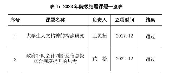 截至2023年12月1日,我院共有2项课题申请结题,6项课题申请延期,5项申请撤销。根据《关于公布2017年度院级课题立项的通知》(上财浙院教字〔2017〕63号)、《关于公布2022年度院级课题立项的通知》(上财浙院教字〔2022〕50号)有关规定,我院对申请结题、延期和撤项的课题材料进行详细审阅后,经过校外专家评审,其中2项课题符合结题要求,同意结题。现将结果予以公布(见表1)。希望各系(部)、部门要进一步加强对各类课题的管理与指导,希望未达到结题要求以及提出延期的课题组按照有关规定和课题研究计划认真开展研究工作。