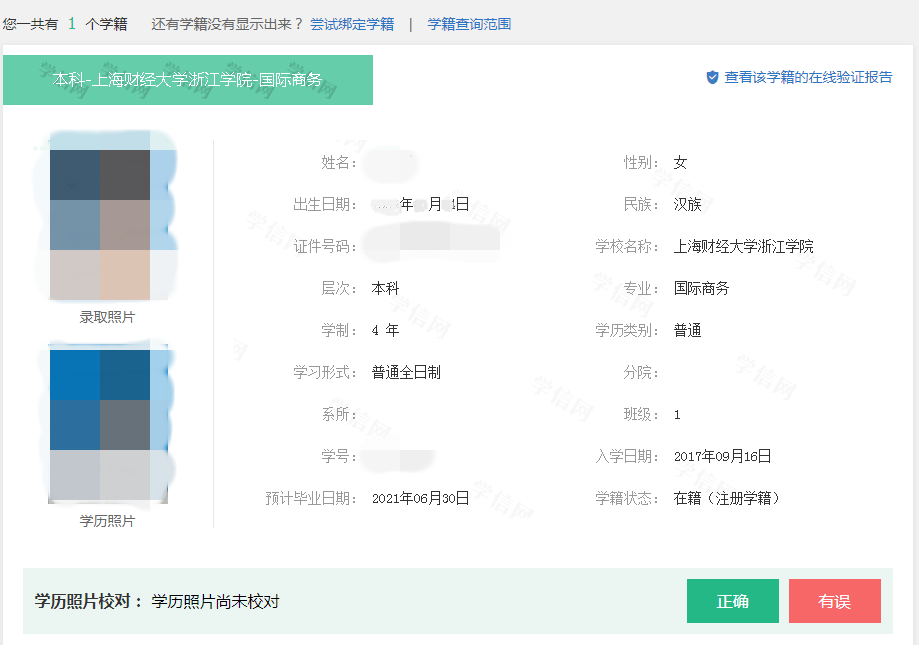 毕业生的学历照片和学籍信息核对无误后,点击下方的“正确”按钮即可。