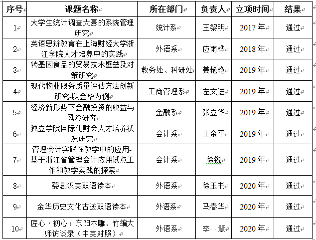 表1:2021年上海财经大学浙江学院发展基金结项结果一览表